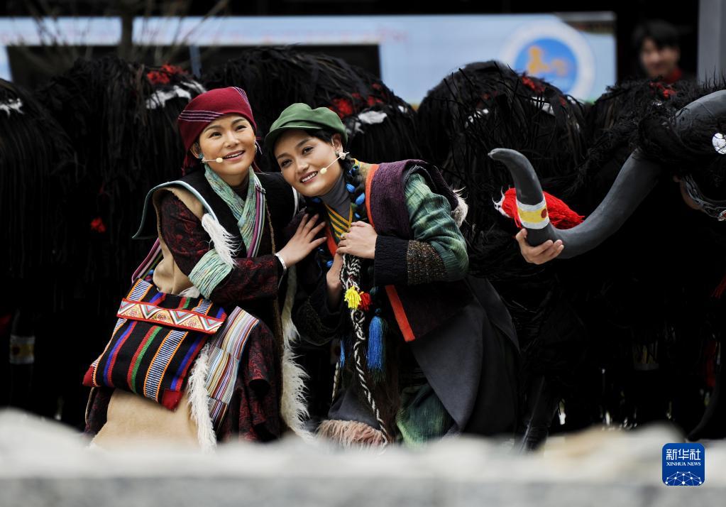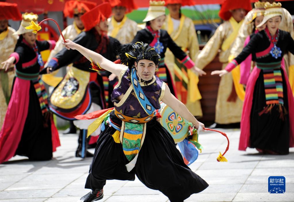5月31日,演員在隆子縣玉麥鄉(xiāng)文化廣場(chǎng)表演歌舞劇《天邊格?;ā?。新華社記者 張汝鋒 攝