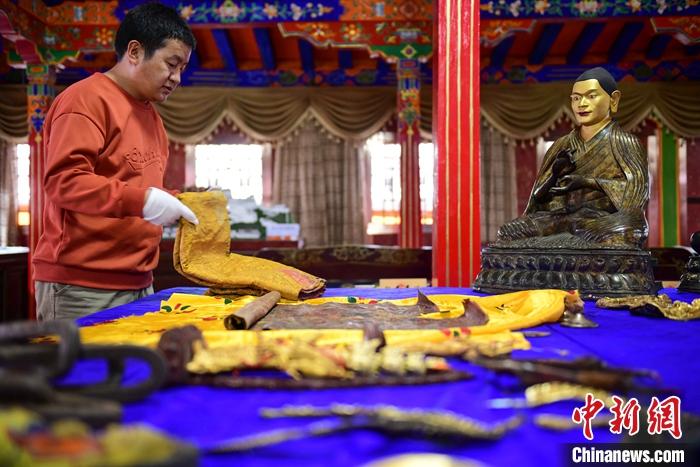 圖為捐贈(zèng)者洛桑旦增正在整理文物。 中新社記者 貢嘎來松 攝