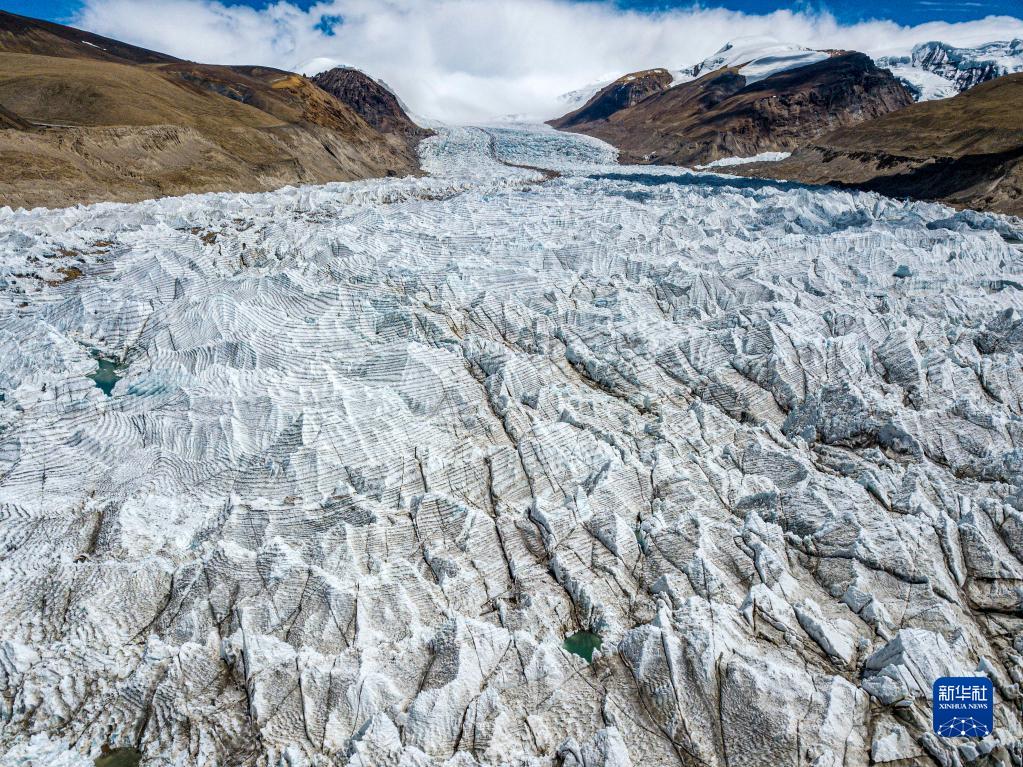 這是5月8日在西藏日喀則市拍攝的珠穆朗瑪峰腳下的絨布冰川(無(wú)人機(jī)照片)。新華社記者 田金文 攝