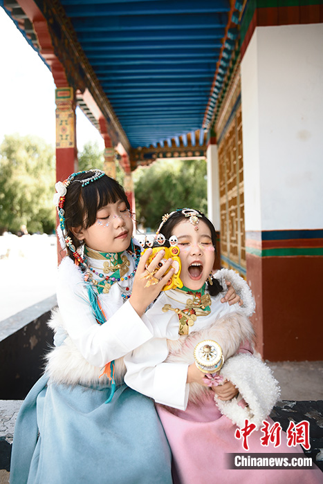 圖為7月13日,兩位小游客在拉薩體驗(yàn)藏族服飾寫真。 中新社發(fā) 郭琳 攝