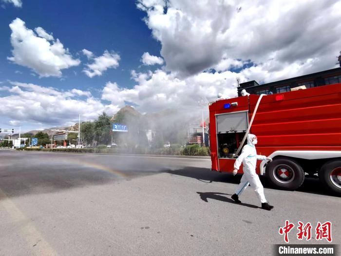 圖為拉薩消防指戰(zhàn)員在主城區(qū)街道進(jìn)行消殺。 拉薩市消防救援支隊 攝