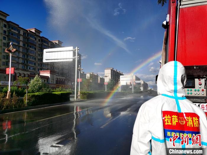 圖為拉薩消防指戰(zhàn)員在主城區(qū)進(jìn)行消殺?!±_市消防救援支隊 攝