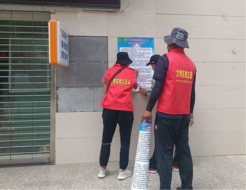 山南市新時代文明實踐志愿者們張貼宣傳單。圖片由貢嘎縣新時代文明實踐中心提供