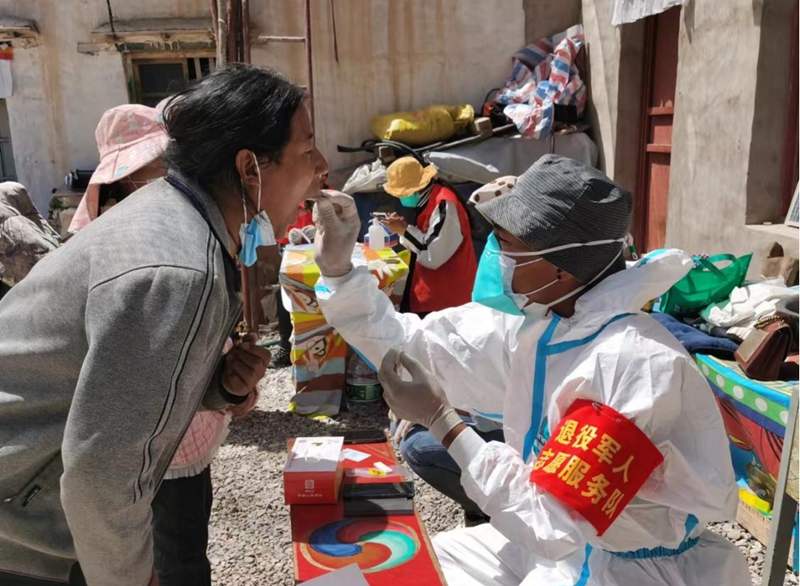 退役軍人志愿服務(wù)隊為群眾進行核酸采樣。圖片由阿里地區(qū)改則縣新時代文明實踐中心提供