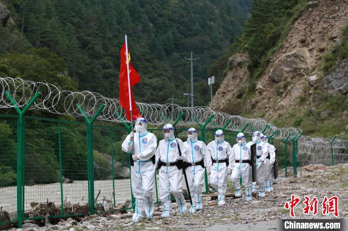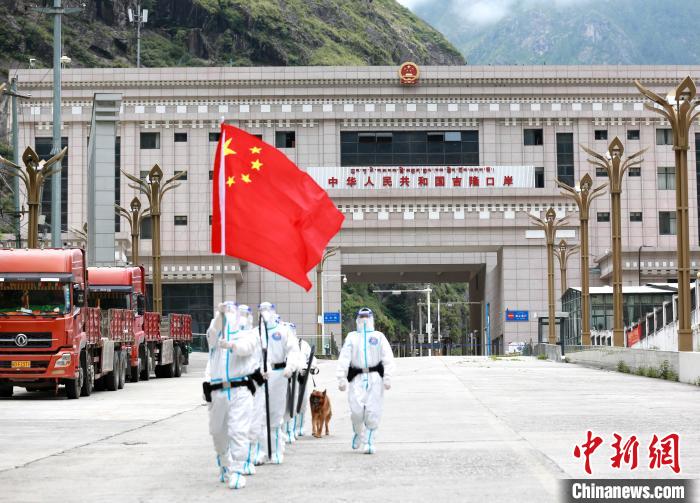 10月1日,駐扎在中尼邊境的吉隆出入境邊防檢查站組織移民管理警察高舉國旗在邊境執(zhí)勤巡邏任務(wù)。