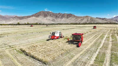 西藏日喀則市江孜縣熱索鄉(xiāng)努康村農機合作社的村民集中對村里三千多畝耕地進行機械化收割新華社記者 晉美多吉攝