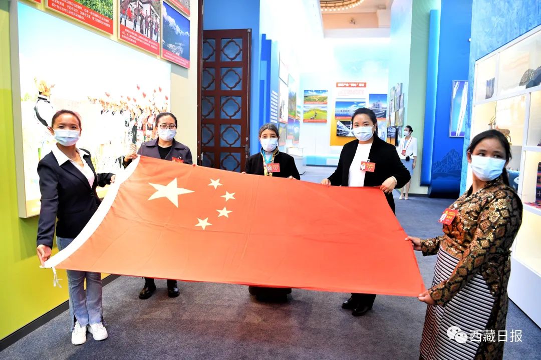 在西藏展區(qū),來自邊境縣的五名基層黨代表共同展示“國(guó)旗老阿媽”留下來的國(guó)旗。記者 旦增西旦 攝