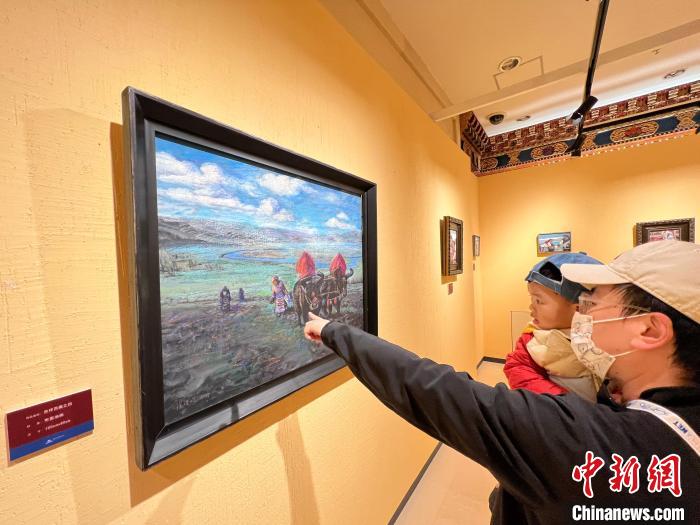 帶兒子一同前來參觀的向先生曾于2013年夏季到西藏旅游。他告訴記者,畫中的風(fēng)景、建筑和服飾非常寫實;有關(guān)冬季的畫作彌補(bǔ)了他未見西藏冬日美景的遺憾。