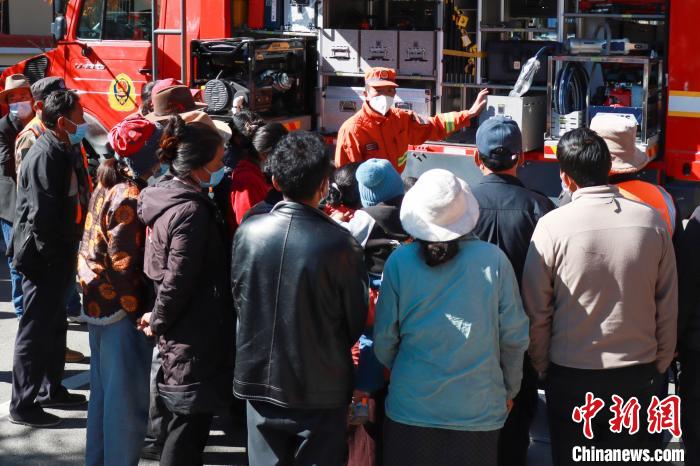 活動現(xiàn)場,消防員向民眾講解裝備操作。 袁勇彬 攝