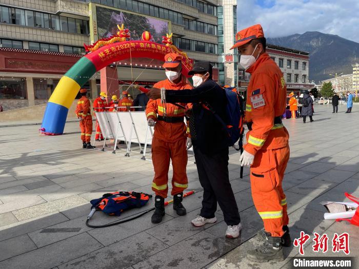消防隊(duì)員正在教授裝備使用方法。 袁永斌 攝