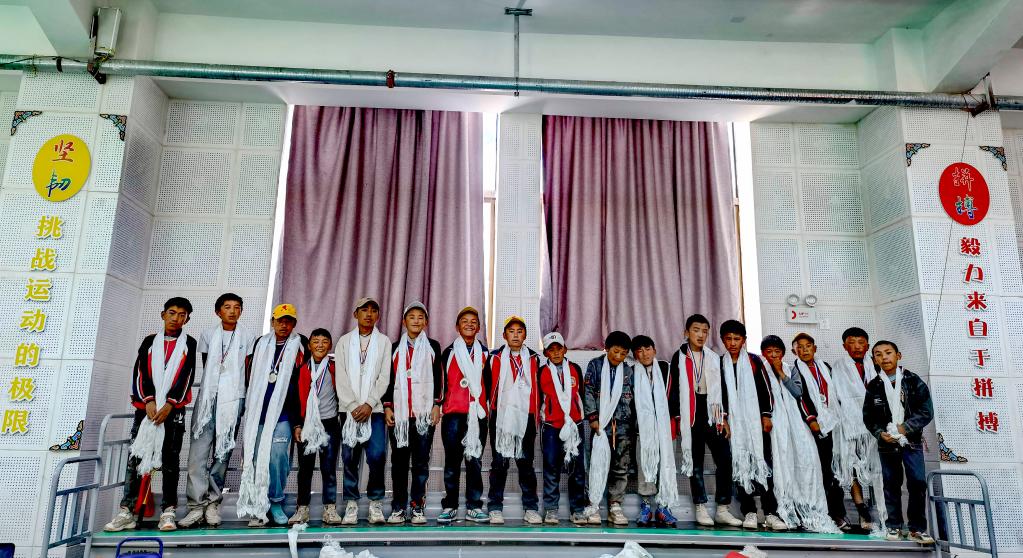 今年6月畢業(yè)前夕,格旦曲桑(前左)和同學(xué)在扎西宗鄉(xiāng)完全小學(xué)的足球場上合影留念