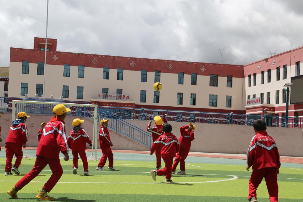 那曲聶榮縣小學(xué)的學(xué)生們正在踢足球(4月20日攝)