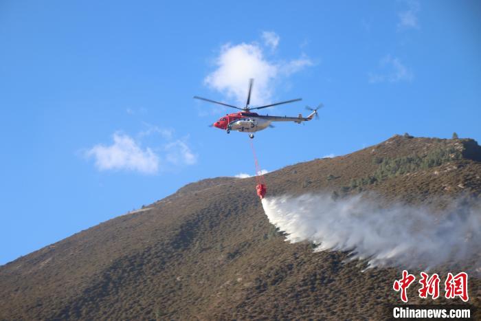 直升機(jī)開展吊桶灑水作業(yè)?!∥骼@拉翁 攝