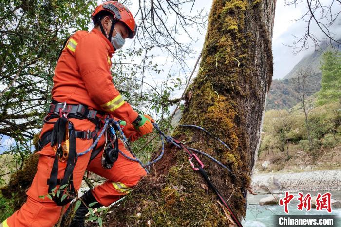 圖為訓(xùn)練現(xiàn)場,指戰(zhàn)員制作繩索救援訓(xùn)練支點(diǎn)?!±顕鵂c 攝