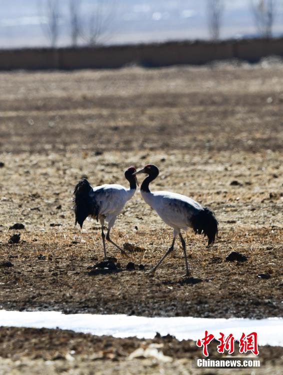 每年的10月底,成群的黑頸鶴飛到西藏拉薩市林周縣越冬,在拉薩市林周縣周邊的湖泊濕地度過5個月的“閑云野鶴”生活,次年三四月份再飛向藏北草原繁殖。黑頸鶴是世界上唯一一種高原鶴類。具有足長、喙長、頸長的典型涉禽類特征,適合在沼澤地里行走。黑頸鶴的頸、尾為黑色,體羽為灰白色。黑頸鶴是國家一級保護動物。目前,每年到林周縣越冬的黑頸鶴已達2000只左右。圖為黑頸鶴在林周境內的農田里覓食、嬉戲。 貢嘎來松 攝