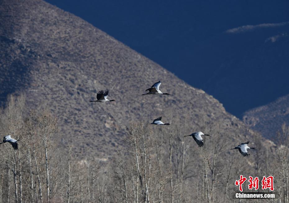 每年的10月底,成群的黑頸鶴飛到西藏拉薩市林周縣越冬,在拉薩市林周縣周邊的湖泊濕地度過5個月的“閑云野鶴”生活,次年三四月份再飛向藏北草原繁殖。黑頸鶴是世界上唯一一種高原鶴類。具有足長、喙長、頸長的典型涉禽類特征,適合在沼澤地里行走。黑頸鶴的頸、尾為黑色,體羽為灰白色。黑頸鶴是國家一級保護動物。目前,每年到林周縣越冬的黑頸鶴已達2000只左右。圖為黑頸鶴在林周境內的農田上空飛翔。 貢嘎來松 攝