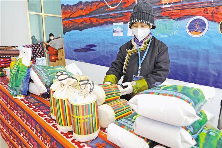 在日土縣展銷區(qū),工作人員在擺放特色產(chǎn)品。記者 永青 攝