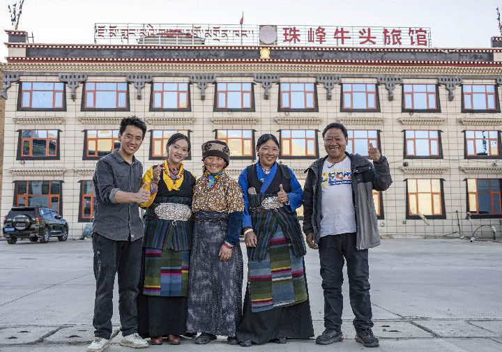 多吉一家在新開(kāi)業(yè)的牛頭旅館前合影留念(2022年5月10日攝)。