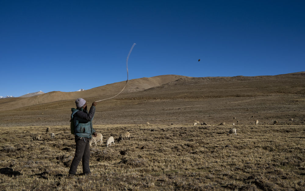藏普村的牧民揮舞著“古爾朵”驅(qū)趕羊群(2022年5月13日攝)。