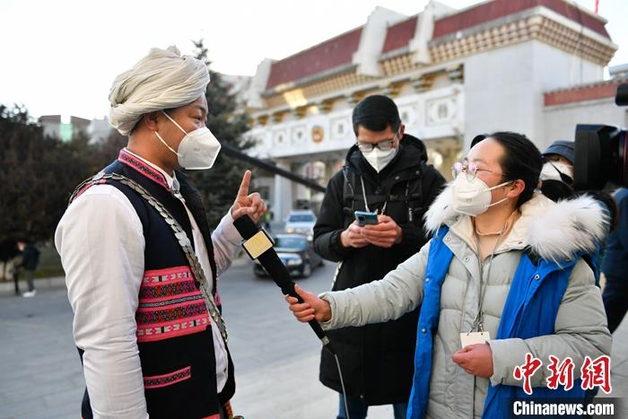 1月12日,政協(xié)第十二屆西藏自治區(qū)委員會(huì)第一次會(huì)議在拉薩開幕,西藏政協(xié)文化藝術(shù)節(jié)界委員迪龍(左)接受媒體的采訪。 中新社記者 貢嘎來松 攝
