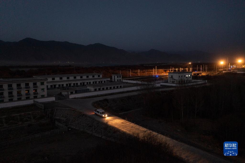 羅布和同事駕車駛出拉林鐵路扎囊工電綜合工區(qū),趕往鋼軌探傷作業(yè)點(1月12日攝,無人機照片)。新華社記者 孫非 攝