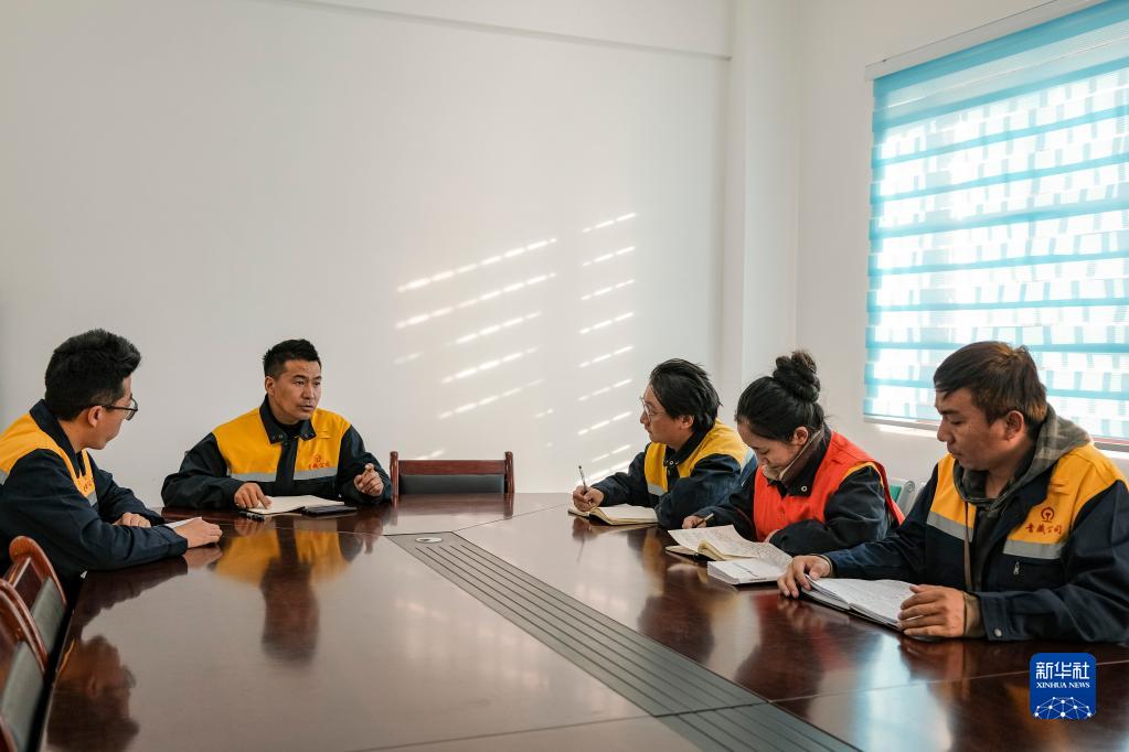 羅布(左二)在班前會上給鋼軌探傷隊員進行任務(wù)部署和安全警示(1月12日攝)。新華社記者 孫非 攝