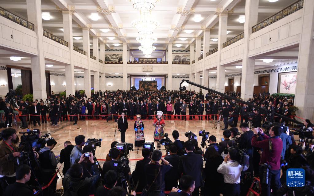 2018年3月11日,十三屆全國人大一次會議在北京人民大會堂舉行第三次全體會議,全國人大代表卓嘎(中)在“代表通道”接受采訪。新華社記者 王建華 攝