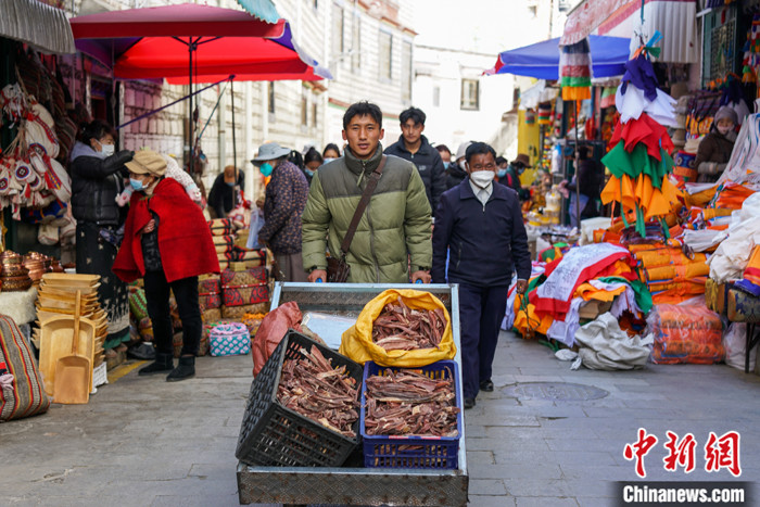 圖為2月13日,西藏牧民旺堆次仁用小車推著自家的風(fēng)干牦牛肉在拉薩年貨市場(chǎng)銷售。中新社記者 江飛波 攝