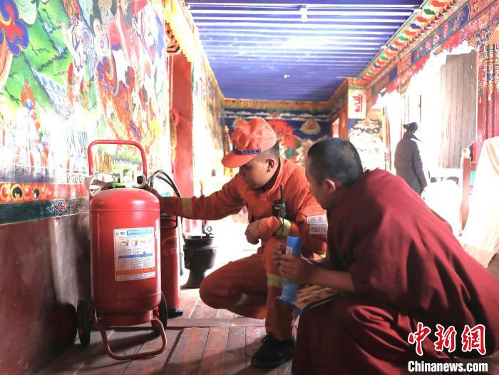 森林消防隊(duì)員為僧人講解滅火器使用方法。 西繞拉翁 攝