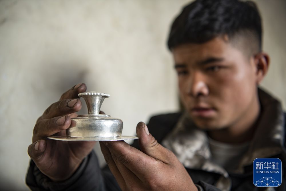 在扎西吉彩金銀銅器廠,一位手工藝人在檢查自己打制的銀器坯子(3月9日攝)。