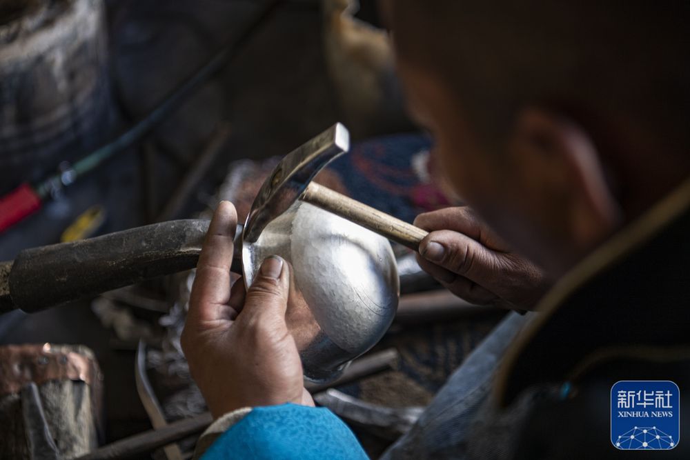 在扎西吉彩金銀銅器廠,一名手工藝人在打制銀器(3月9日攝)。