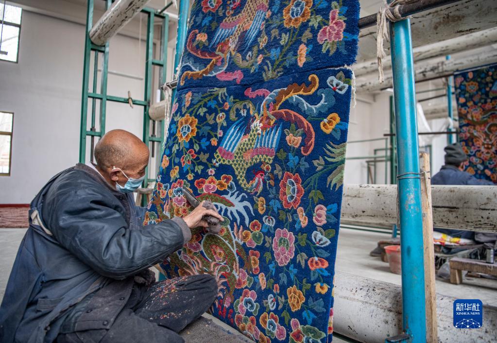 普瓊16歲開始接觸藏毯織造。他說,編織好的毯子需要經(jīng)過“剪花”,讓圖案更加立體和鮮艷。由于圖案細(xì)密、復(fù)雜,他面前的這張?zhí)鹤有枰?天左右才能剪出來。