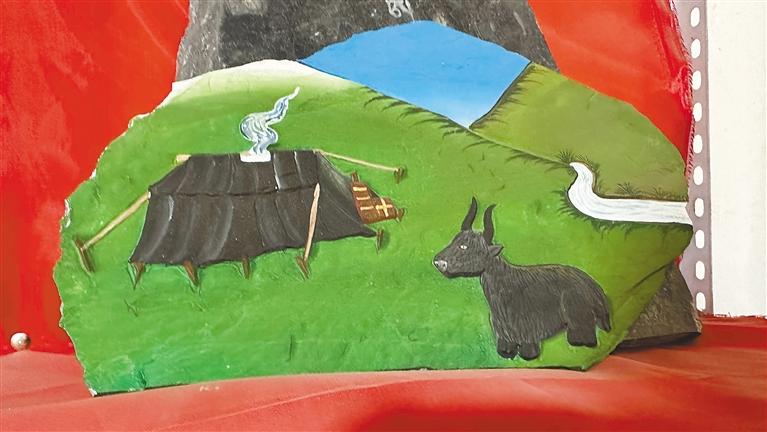 “我們首先要選好一塊石頭,根據(jù)它的形狀和質(zhì)地來(lái)決定刻成一幅什么樣的作品,然后再畫出作品的輪廓進(jìn)行雕刻,最后一步則為上色?!鄙V懿湃薀崆榈貛覀儏⒂^他的工作室,“慶祝中國(guó)共產(chǎn)黨成立100周年”“牧家生活”“扎西德勒”“白海螺”“和氣四瑞像”……每一幅作品活靈活現(xiàn)在大大小小石板上,栩栩如生、惟妙惟肖,堅(jiān)硬的石頭在他出神入化的雕工下竟變得柔軟,又不失力量和美感。