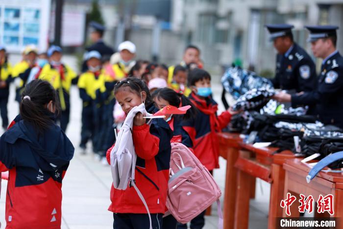 移民管理警察為學生發(fā)放書包,鼓勵學生好好學習,將來成為棟梁之材。 肖富貴 攝