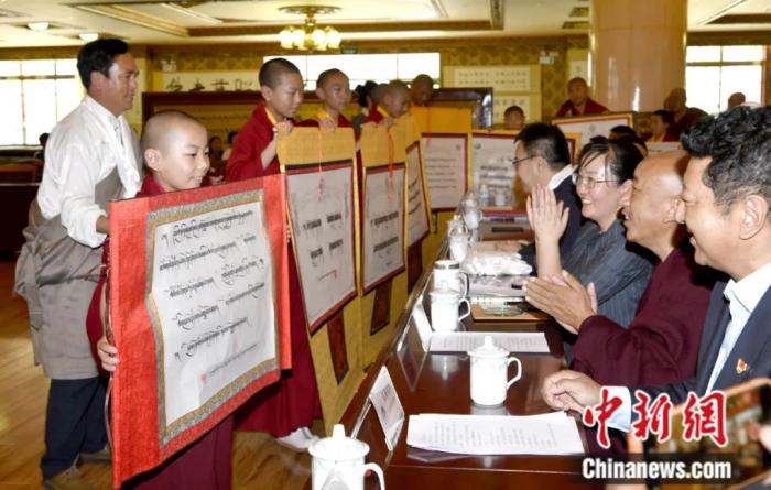 2022年7月,西藏佛學(xué)院9名少年活佛完成小學(xué)階段學(xué)習(xí),在拉薩順利畢業(yè)。圖為少年活佛們?cè)诋厴I(yè)典禮教育成果展上展示藏漢書(shū)法作品。李林 攝