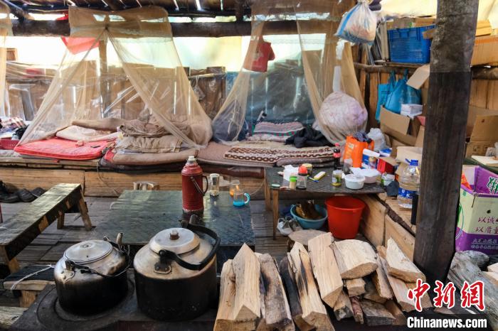 德瑪龍6號(hào)執(zhí)勤點(diǎn)木板房是大家在森林里的庇護(hù)所,進(jìn)入后可以看到房內(nèi)左右兩側(cè)布置了兩排通鋪,每人的床位由一個(gè)罩式蚊帳以及被褥組成,屋子中間有個(gè)藏式爐子,里面燒著并不干燥的木柴。
