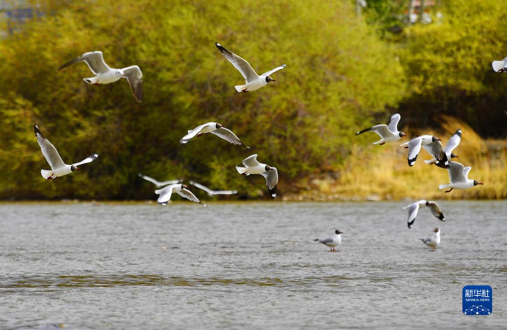 棕頭鷗在拉薩河上嬉戲(4月16日攝)。新華社記者 張汝鋒 攝
