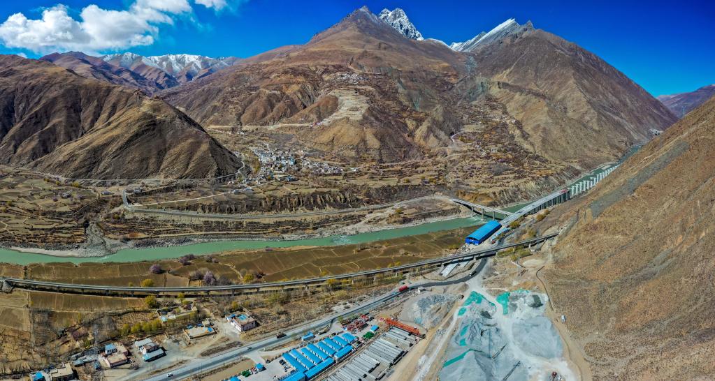 鳥瞰拉薩至日喀則高速公路五曲雅江大橋建設(shè)現(xiàn)場(無人機照片,3月12日攝)。新華社記者姜帆 攝