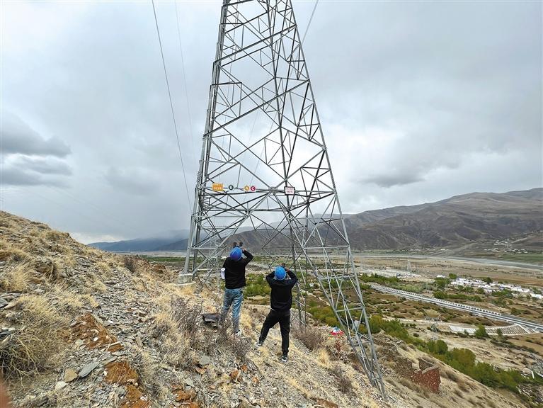 4月30日上午,國網(wǎng)日喀則供電公司輸電運檢中心工作人員在巡檢線路。袁海霞 鄭璐 攝