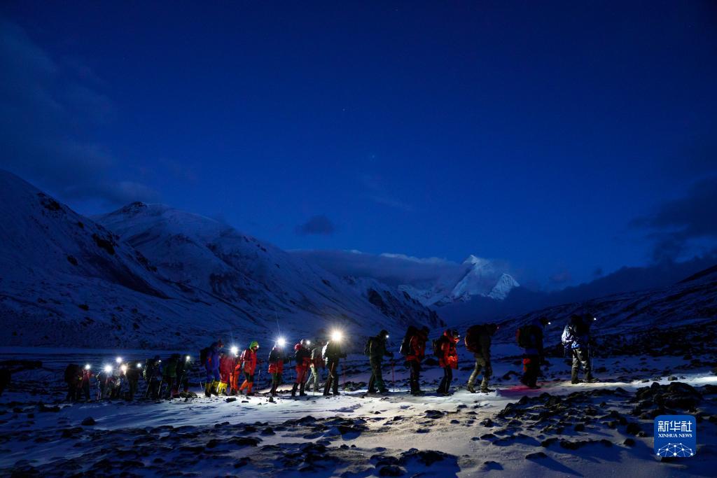 5月3日,登山愛(ài)好者在凌晨出發(fā),開始攀登海拔6010米的洛堆峰。新華社記者 孫非 攝