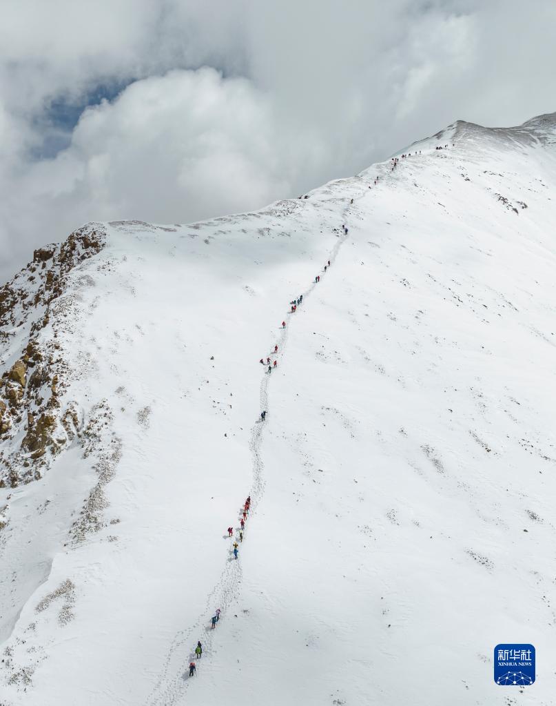 5月3日,登山愛(ài)好者正在向海拔6010米的洛堆峰峰頂進(jìn)發(fā)(無(wú)人機(jī)照片)。新華社記者 孫非 攝