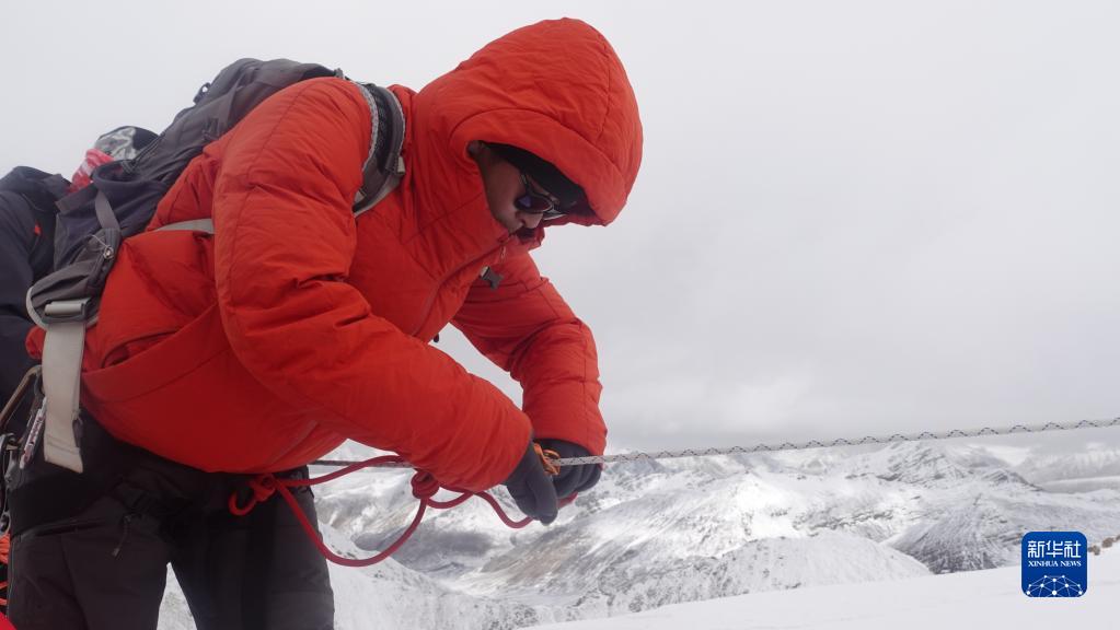 5月3日,登山愛(ài)好者在海拔6010米的洛堆峰峰頂拍照留念。新華社記者 黃耀漫 攝