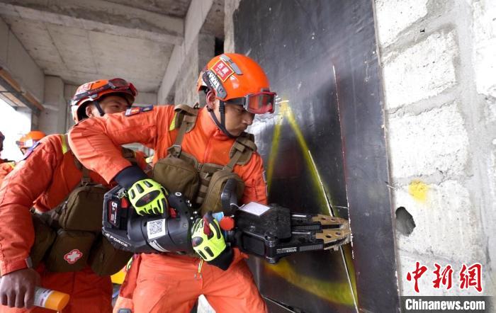 圖為演練中指戰(zhàn)員在電梯井進行破拆。西繞拉翁 攝