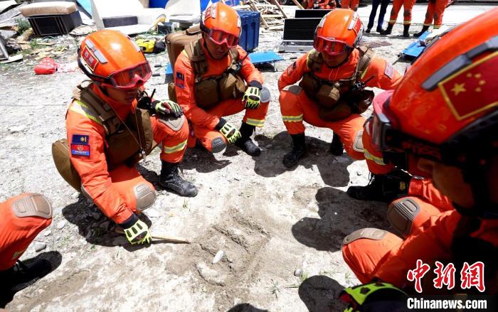 圖為演練中指戰(zhàn)員正在研究制定救援方案。西繞拉翁 攝