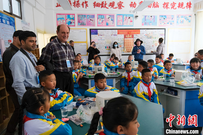 圖為5月18日上午,參訪團成員在林芝市第二小學觀看孩子們上實驗課。中新社記者 江飛波 攝
