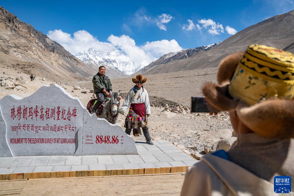 在珠峰大本營的珠峰高程測量紀(jì)念碑前,游客拍照留念(5月20日攝)。新華社記者 孫非 攝