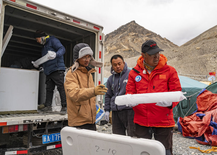 在珠峰登山大本營,中科院西北生態(tài)環(huán)境資源研究院副院長康世昌查看從珠峰海拔約6500米處鉆取的冰芯樣品(5月22日攝)。新華社記者 孫非 攝