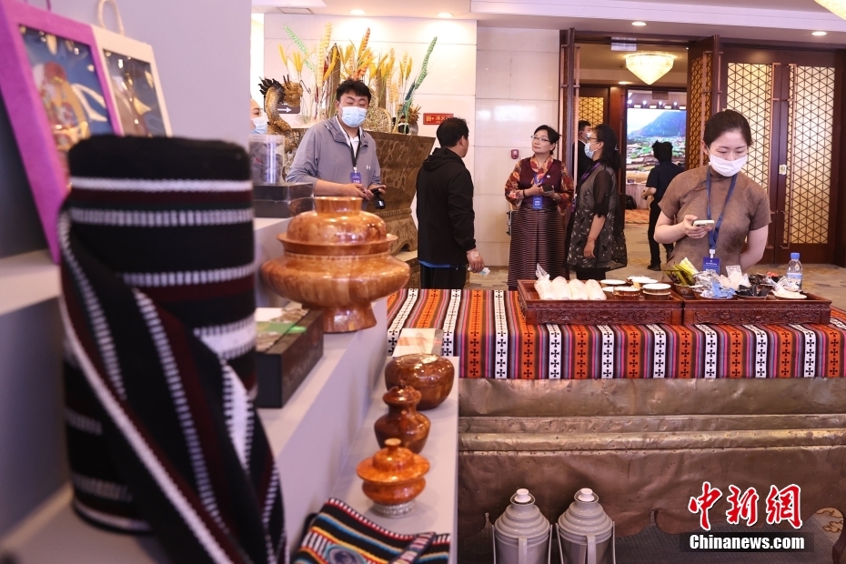 5月23日,“2023·中國西藏發(fā)展論壇”在北京舉行。會場外,活潑獨特的藏式迎賓舞蹈、展示西藏人文自然風貌的圖片,已在論壇開幕前預熱起探討西藏新發(fā)展的氛圍。圖為展臺上,布置著色彩豐富的藏式布匹、紙藝文創(chuàng)產(chǎn)品、藏香、酥油茶等。