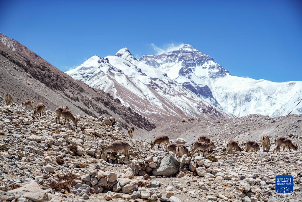 一群巖羊在珠峰腳下覓食(5月9日攝)。新華社記者 孫非 攝