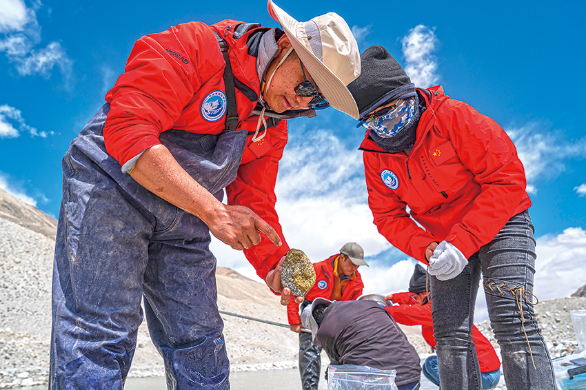 在珠峰登山大本營附近,來自西藏大學(xué)生態(tài)環(huán)境學(xué)院的科考隊(duì)員張繼峰(左)在查看附著在石頭上的藻類生物(5月22日攝)。新華社記者孫非攝
